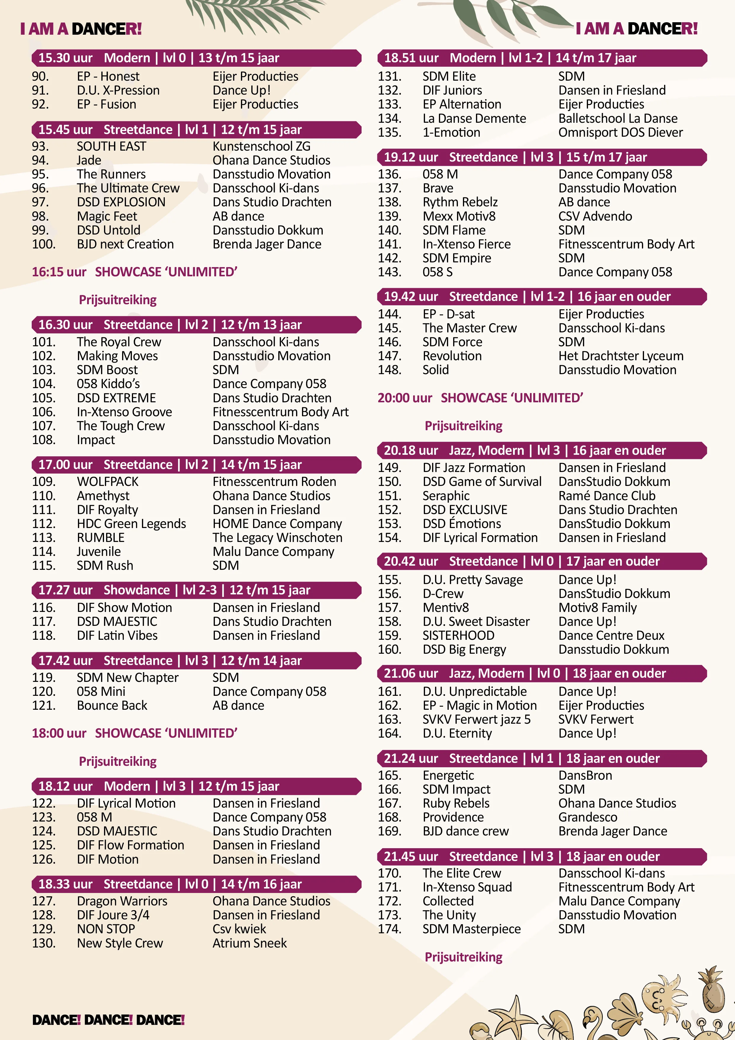 De planning is zo gemaakt dat alle dansers (met één optreden) minimaal 2 tot 3 workshops kunnen volgen.